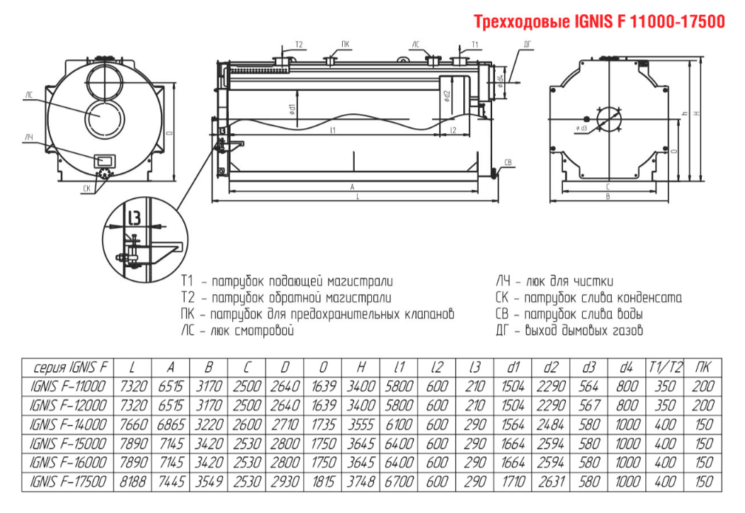 Технические характеристики водогрейного трёхходового котла ARCUS IGNIS F-14000